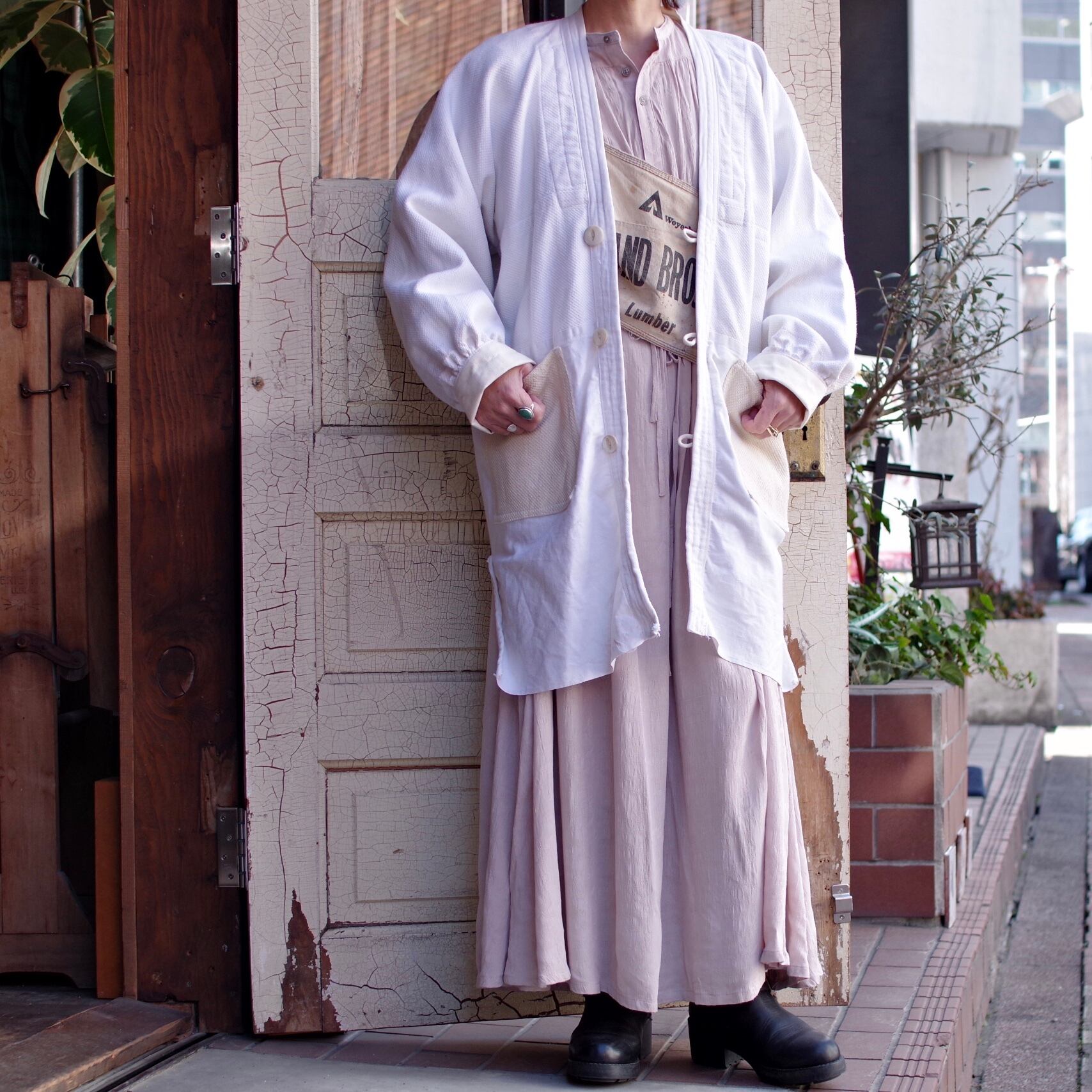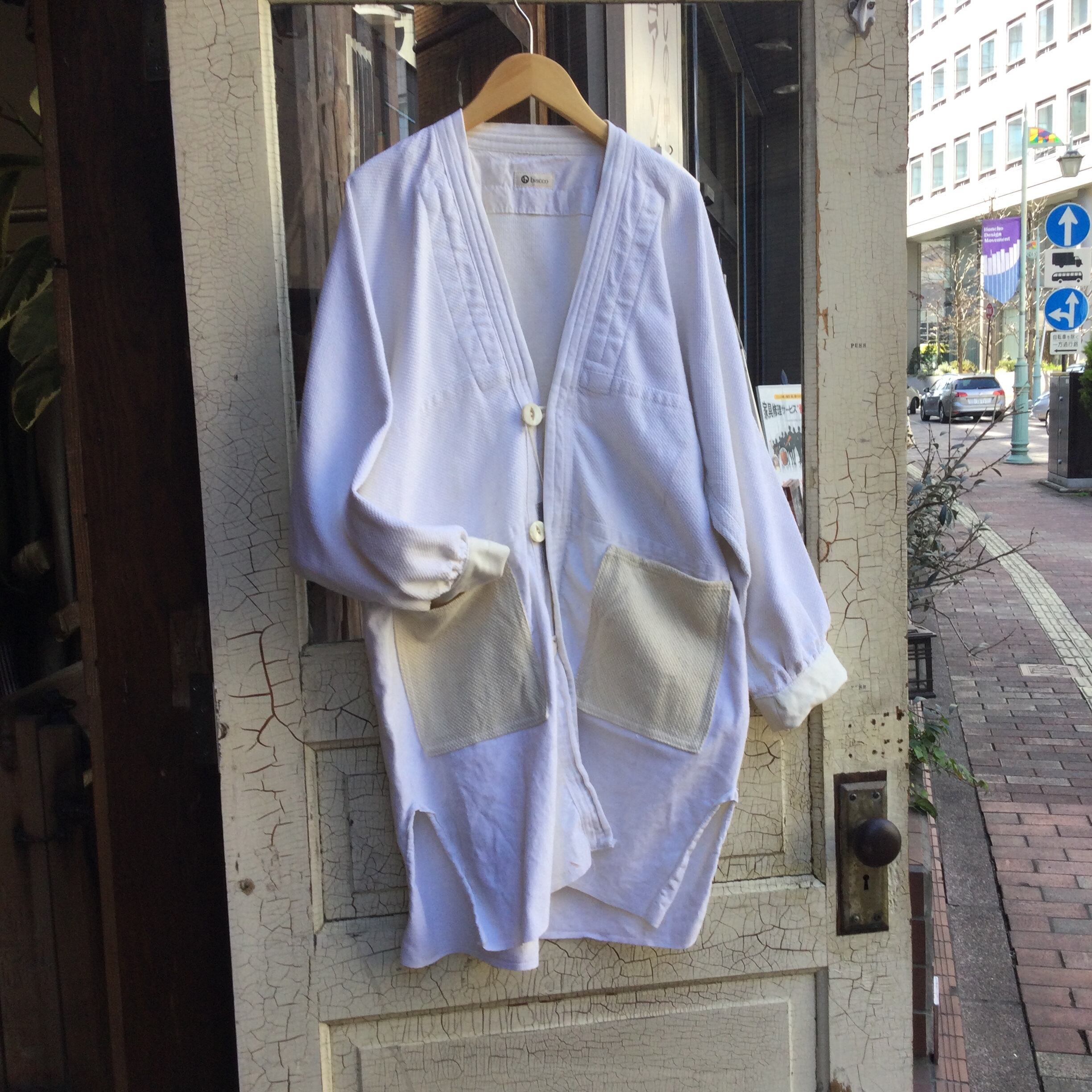 袖口にカフスを足し、前はヴィンテージのボリュームあるシェルボタンを使用し、ループで留めれるようにしてあります。