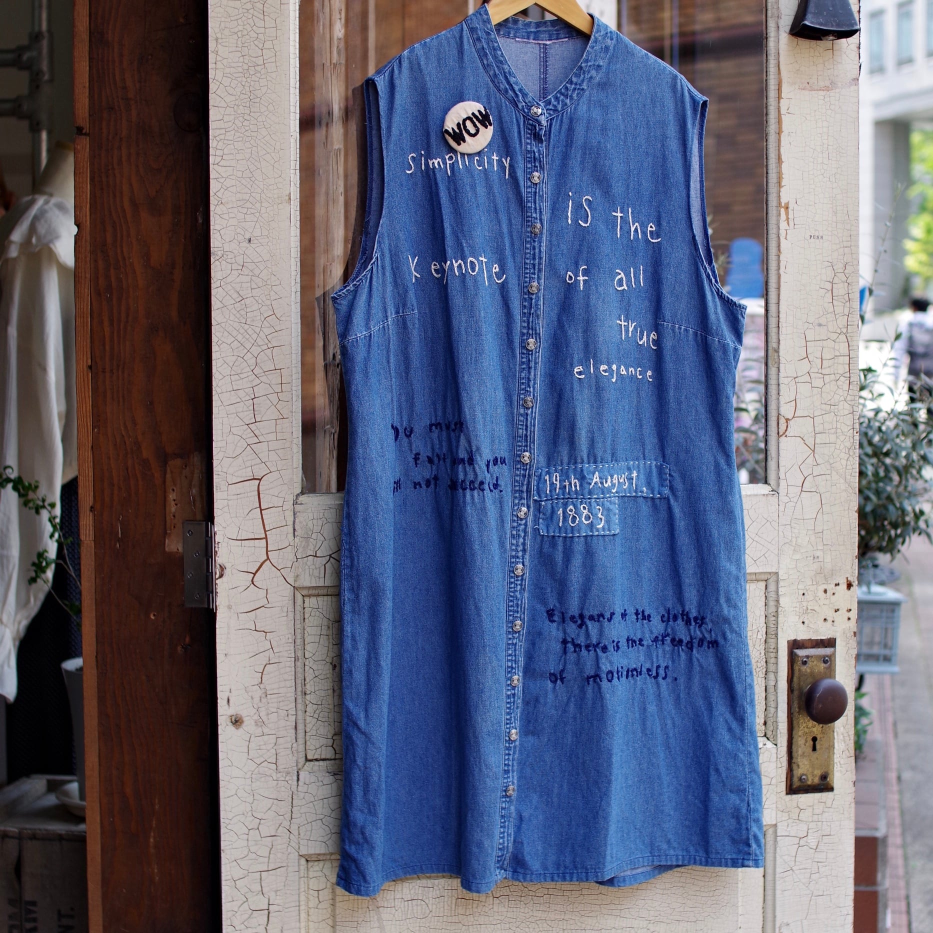 バンドカラーに直し、袖もカットしベストに仕上げ、後にパチポケを付け加え、刺繍とステンシルを入れました。